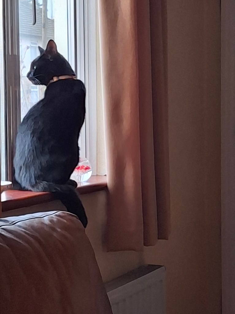 She has developed an expectation of being let in too. One afternoon last week I saw her stalking purposefully down the path towards the back door, opened it as she got there, and she walked in without breaking stride. I felt as though I should have saluted. She now explores, sits on the windowsill and watches the world go by, curls up on my chair and goes to sleep, dances around our feet, does somersaults and head nudges and is generally affectionate and playful. Except when she’s eating a “Bonkers” chicken “lolly” and you pull it back a bit so she doesn’t crunch it all at once. At that point she turns into Gollum. Head hunches, yellow eyes narrow and glare, paw streaks forward with claws out to hold on to it. “My precioussss!”