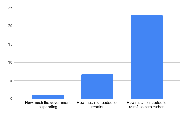 This graph shows that the government’s planned investment of £1 billion in the schools estate over ten years is less than one sixth of what is needed just to deal with repairs and just one pound for every twenty three that would be needed to make all our school buildings zero carbon by 2030.