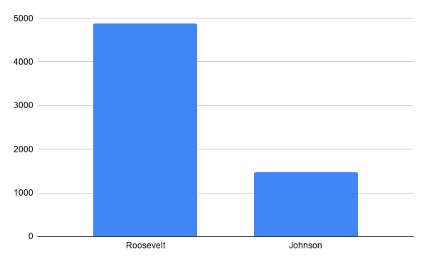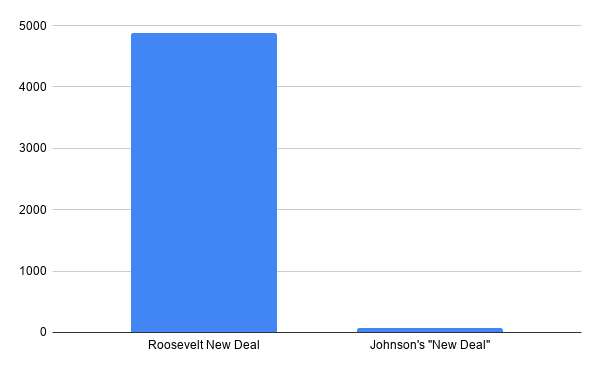 1. Roosevelt’s New Deal lasted six years. Johnson’s is spread over ten. So, a quarter as much over nearly twice as long.