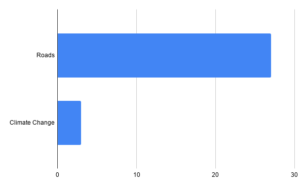 More to the immediate point, it is only one pound for every nine they are spending on roads. That looks like this, showing the balance in Conservative souls between saving civilisation and building some bypasses.