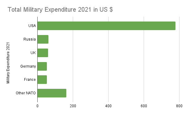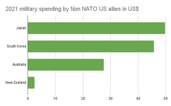 Japan, South Korea, Australia and New Zealand are also bound to the US by non NATO military alliances. Add their 6.3% to NATO’s 55.8% and you get 62.1% of global military spending made by countries in US led military alliances. In addition, some of the other countries in the top 20 military spenders also tend to align with the US even without a treaty obligation to do so, like Israel and Saudi Arabia.