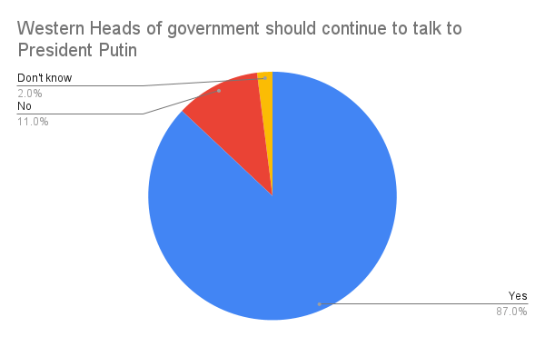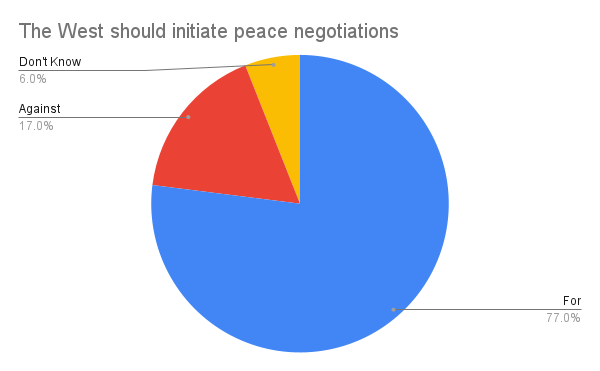 In a survey conducted recently by opinion research institute Forsa for the RTL / ntv “Trend barometer” there are very strong majorities for “the West” to initiate peace negotiations (Graph 1) for “Western leaders” to keep talking to Russian President Putin (Graph 2).