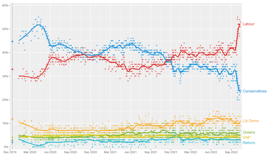 By Ralbegen – Own visualisation of polling data collated on w:Opinion polling for the next United Kingdom general election. Sources for individual data points can be found on that page., CC BY-SA 4.0, https://commons.wikimedia.org/w/index.php?curid=90612156