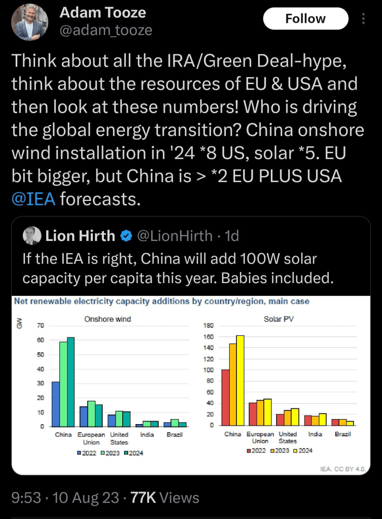 They are also spending twice as much on energy transition as they are on their military. The US is spending 18 times as much on its military as on the energy transition. Which sums up their relative priorities.