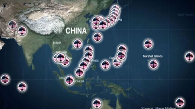You can look at it in terms of overseas bases too. The US has 750 bases in 80 countries. China has 1 (in 1). The US bases near China encircle it, as we can see here. There are no Chinese bases anywhere near the United States.