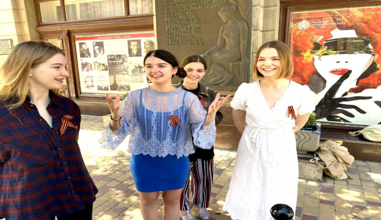 Theatre students in Simferopol Crimea wearing orange and black ribbons and singing songs on Victory Day May 6th 2023. Photo Dan Kovalic. For a view of how Crimea broke from Ukraine in 2014 and what it is like now see Dan’s article with Rick Sterling here.