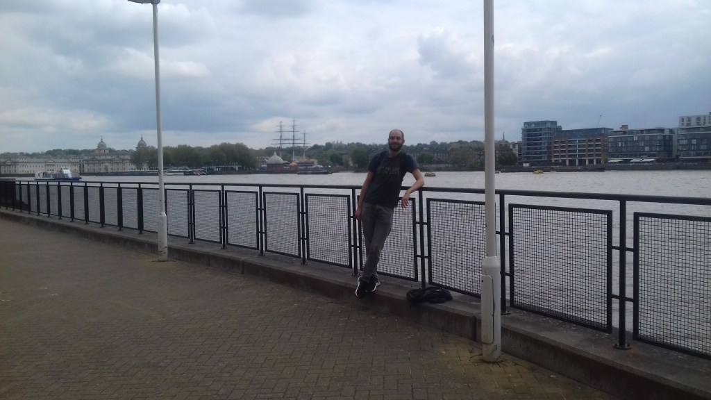 How not to take a scenic photo. Greenwich in the gloom, with the Cutty Sark’s masts centred, the Royal Naval College to the left, and Jamie in silhouette in foreground.