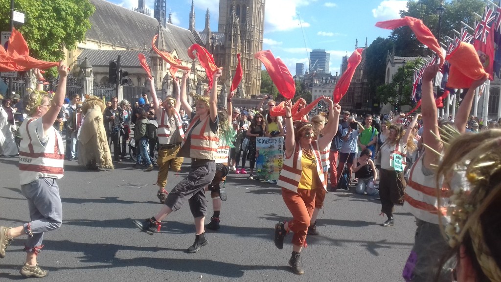 At the end of the huge Restore Nature March in London on Saturday, the magnificent Mayday Morris team from South Devon finish off with a display of pagan exhuberance in Whitehall. The brown shrouded figure with antlers in the background wanders in and out like a gentle reminder of doom.