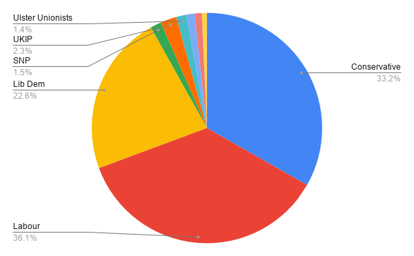 This election might have been the first one to actually be called under PR, but wasn’t. Part of the deal between Clegg and Cameron was to hold a referendum on introducing it. Thoroughly out-manoeuvred by the Conservatives – stitched up a treat by them, on this as well as so many other issues – the Lib Dem proposals for an Alternative Vote system to replace FPTP were defeated in 2011 by 67:32% on a dismal 42% turnout; showing that the electorate “wasn’t bothered”.