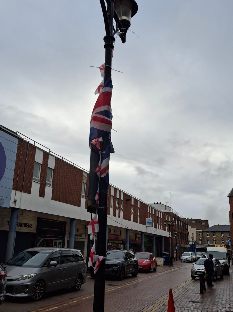 The move to fly Union Jacks and St George’s crosses in public areas – attached to lamp posts and so on – is quite extensive in some areas. Particularly where Far Right activists have painted red crosses on the white stripes on roundabouts and zebra crossings. Why they want people walking on the flag I’m not sure. Some of these in Kent are being flown from quite well to do properties, which should remind us that Nigel Farage is a stockbroker from Sevenoaks, who shows that he is a “man of the people” by banking with Coutts.