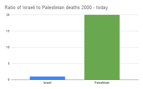 Nor does he reflect that the overall death rate since 2000 has been twenty Palestinians killed for every Israeli.