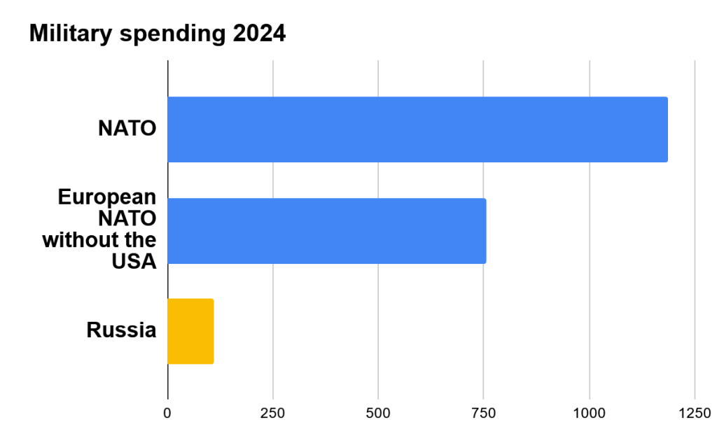 To underline this with stark figures, with overall NATO spending in 2024 at $1185 billion and Russia’s at $109 billion,