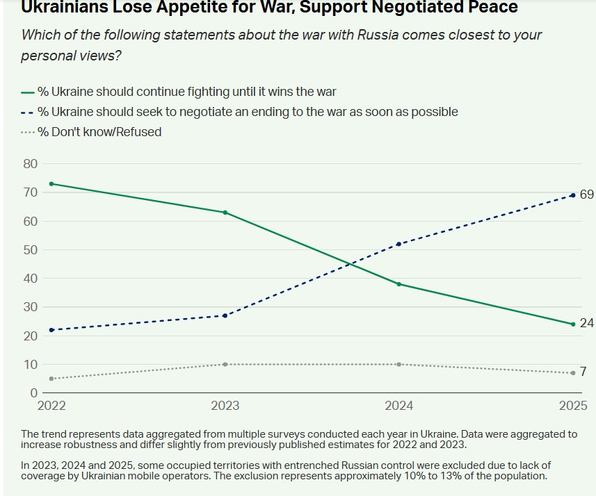 This marks a nearly complete reversal from public opinion in 2022, when 73% favored Ukraine fighting until victory and 22% preferred that Ukraine seek a negotiated end as soon as possible.