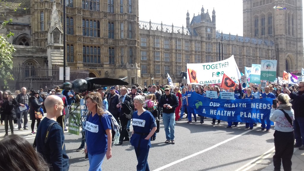 Sometimes there is a protest in central London that overwhelms and redefines it for a while. On the first day of The Big One, it was almost like that. You could hear the drums in the underpass. “Oh God! Those drums! We’ll all be murdered in our beds”, as they used to say on colonial verandas (and possibly still do in Daily Mail editorial meetings). Out of the tunnel and into the reassuring grey of the sort of London Spring characteristic of the epoch we are losing, and the streets are seeded with business like protest organisers in high viz jackets with XR stickers, in an odd balance with lots of tourists, doing the things that tourists do, moving in herds led by guides holding up umbrellas so they don’t get lost, taking photos of each other leaning on the doors of the iconic Gilbert Scott red phone boxes no one uses anymore (with the Houses of Parliament as a backdrop for the perfect evidence of having been here and seen that) school trips in chatty crocodiles up and down the paving stones, in and out of the Abbey.
